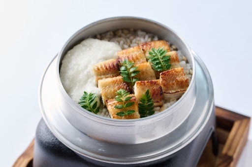 夏の体が喜ぶ鰻を、脂の旨味が引き立つよう白焼きにし、もち麦を使った麦飯にのせた釜飯です。長芋と大和芋を使ったトロロは滑らかな口触りで、食欲をそそります。