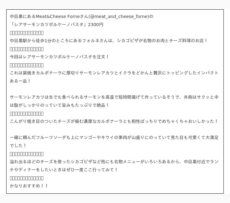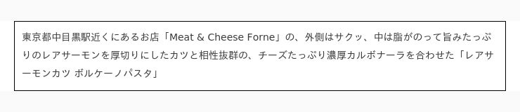 今回は『Forne』にて強烈なインパクト商品が登場!数々の有名インフルエンサー様が話題としている「レアカツサーモンのボルケーノパスタ」はカルボナーラボルケーノパスタの上に極厚レアサーモンカツ(200g)を乗せた明ボリューム満点の商品!思わず写真を撮りたくなる一品です!
