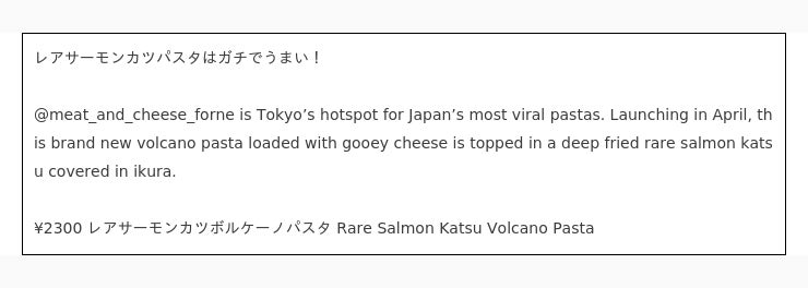 話題のグルメ・インフルエンサー様が大絶賛!レアサーモンカツのボルケーノパスタ!