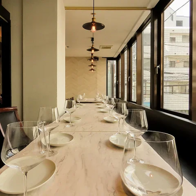 店内は白を基調としており、窓側の席では目黒川の桜も見る事ができます。さらに!コース料理ご注文のグループに限り、お誕生日・記念日のお客様限定で「自家製ハート型ホールケーキ」プレゼント!
