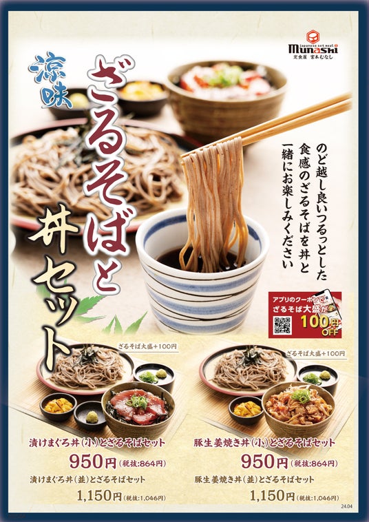 M&Sフードサービス株式会社(本社:大阪府大阪市、代表取締役社長:夏井 克典)が運営する定食チェーン「定食屋 宮本むなし」では、漬けまぐろ丼と豚生姜焼き丼にざるそばがセットになった「ざるそばと丼セット」を2024年4月10日(水)より期間限定で販売開始します。