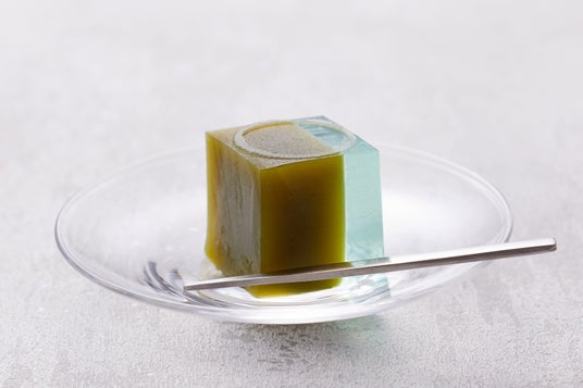 2025大阪・関西万博の会場となる夢洲をモチーフにしたようかんで、西山美里さん(環境都市工学部 3年生)のアイデアです。陸と海、そして会場のリング(大屋根)をキューブの中に表現しています。陸の部分は抹茶ようかん、海はうっすら水色に染めた錦玉かん(寒天ゼリー)で、リングは"刷り込み"と呼ばれる技術を使い、舞洲の会場を表現しました。