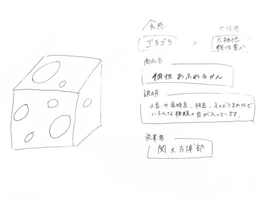 シンプルながら見た目も美しく、食べたときにはゴロゴロとした豆の食感と個性ある味が楽しめる、まさに「個性たのしもー!」なようかんです。