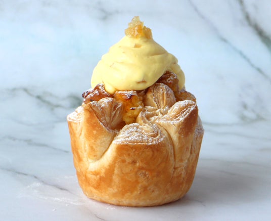 国産ふじりんごとカスタードクリームを包んだアップルカップに瀬戸内産レモンピール入りのクリームの爽やかさが引き立つすっきりとした味わいの逸品。軽快な酸味とコクのある優しい甘さのアップルパイが絶妙にマッチします。王冠を思わせるカタチで、小ぶりなのに手に取ると“ずっしり感”があり、手土産や自分へのご褒美におすすめ。ぎっしり詰まった国産りんごと、ほろほろと口どけるパイ生地、たっぷりのクリームが織りなすマリアージュをお楽しみいただけます。