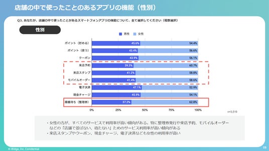 女性のほうがアプリを活用しており、特に「店舗で並ばない、待たない」ためのサービスの活用率が高い