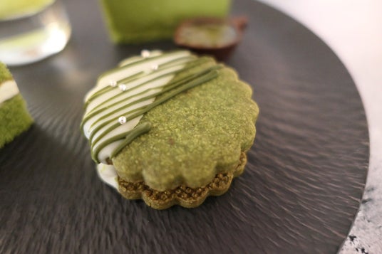 1段目のトレーには緑が目を惹く静岡県の素材がラインナップ。静岡抹茶のショートケーキ、ムース、クッキーと静岡産メロンのゼリー。