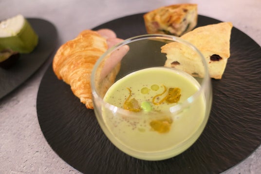 グリーンピースのスープ 緑鮮やかな旬のグリーンピースのホットスープ。アクセントにオレンジピール。