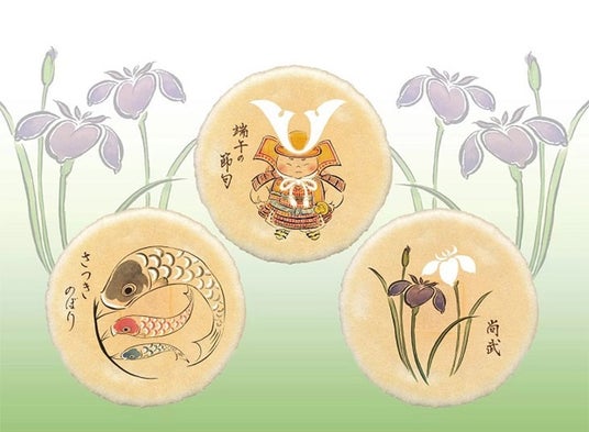 鎧兜、菖蒲、こいのぼりを描いた麩焼きせんべい。