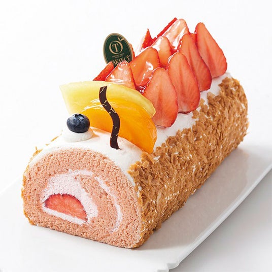 苺風味のスポンジで苺を巻いたロールケーキ。飾りの苺などで鯉のぼりに見立てました。