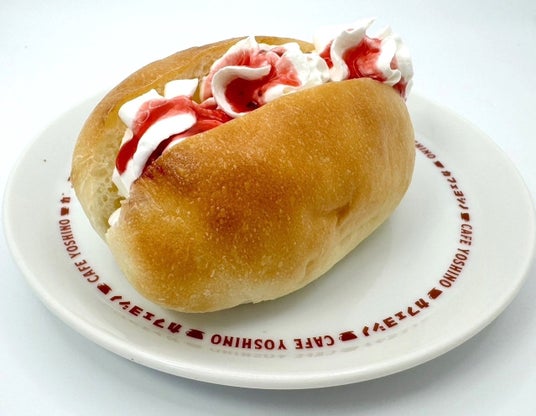 「イチゴホイップサンド」もちもち食感の生こっぺパンに、イチゴソースをかけたホイップクリームをサンドしました。北海道産小麦、北海道産てんさい糖を100%使用し、国産素材にこだわったランチ限定メニューです。