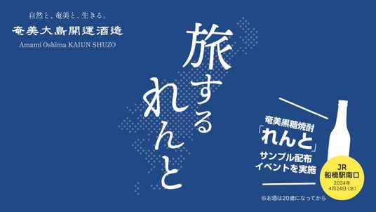 株式会社奄美大島開運酒造(代表取締役 渡 慶彦、本社:鹿児島県大島郡宇検村)は、2024年4月24日(水)に千葉県のJR船橋駅(総武線)南口にて、代表製品である奄美黒糖焼酎『れんと』の特別イベント、「旅するれんと」奄美黒糖焼酎『れんと』街頭サンプリング(以下、本イベント)を実施いたします。