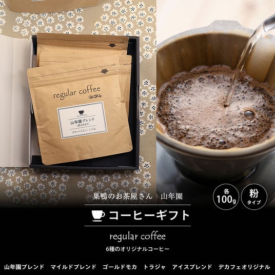 種類は6種類:山年園ブレンド・マイルドブレンド・ゴールドモカ・アイスブレンド・トラジャ・デカフェオリジナル