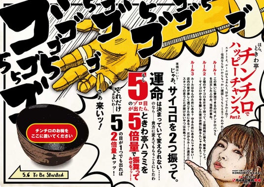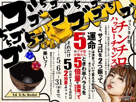 GOSSO株式会社(本社:東京都渋谷区、代表取締役:藤田建、以下 当社)は、「0秒レモンサワー(R) 仙台ホルモン焼肉酒場 ときわ亭」(一部店舗を除く)にて、5月6日(月)~5月31日(金)の期間限定で、アプリ会員向けに、「チンチロハラミ」ご注文いただくとチンチロチャレンジできる『チンチロでハッピーチャンスpart2.』を開催いたします。5月にちなんで、2つのサイコロを振って、5が1つ出たらハラミ2倍量、5のゾロ目ならハラミ5倍量にサービスします。https://zero-tokiwa.com/