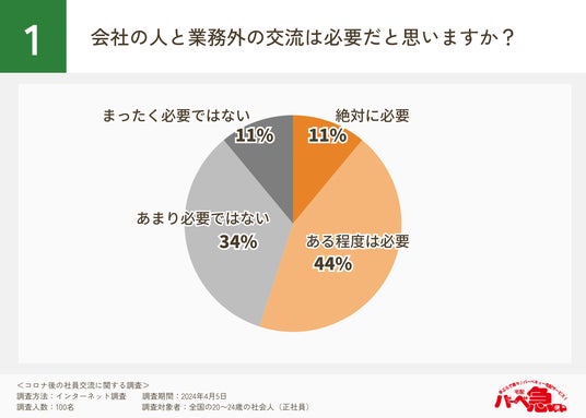 はじめに、会社の人と業務外の交流は必要だと思うか伺ったところ、「ある程度は必要(44.0%)」「絶対に必要(11.0%)」という回答が集まりました。
