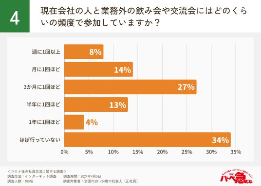 次に、現在会社の人と業務外の飲み会や交流会にはどのくらいの頻度で参加しているのか伺ったところ、「ほぼ行っていない(34.0%)」「3か月に1回ほど(27.0%)」「月に1回ほど(14.0%)」という回答が集まりました。
