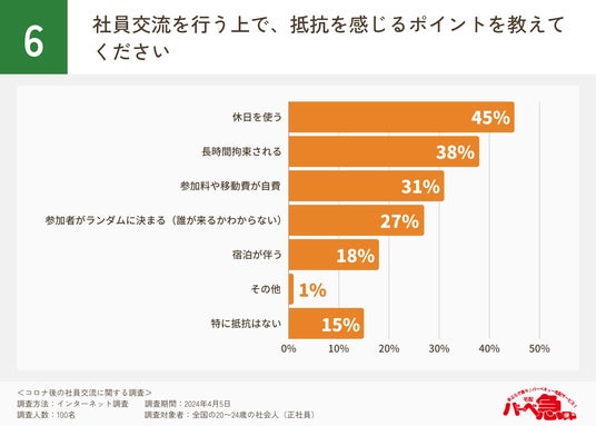 次に、社員交流を行う上で、抵抗を感じるポイントについて伺ったところ、「休日を使う(45.0%)」「長時間拘束される(38.0%)」「参加料や移動費が自費(31.0%)」という回答が集まりました。