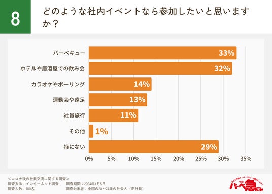最後に、どのような社内イベントなら参加したいと思うか伺ったところ、「バーベキュー(33.0%)」「ホテルや居酒屋での飲み会(32.0%)」という回答が集まりました。