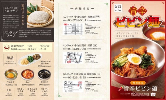 アークランドサービスホールディングス株式会社の子会社、「肉めし岡もと」などを運営する株式会社トビラダイニング(本社:東京都千代田区/代表:大内 勇一)は、スンドゥブ定食専門店「スンドゥブ 中山豆腐店」にて、期間限定メニュー「旨辛ビビン麺」を2024年4月25日(木)より販売を開始いたします。
