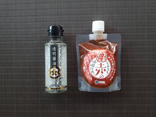 2.調味料セット(山鹿老舗醤油蔵『丸亀醤油』たまご醤油・赤みそだし、熊本老舗醤油メーカーの透明醤油)