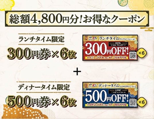 ・300円券は16時までのご来店でお会計税込1,500円毎に1枚ご利用可能、500円券は16時以降のご来店でお会計税込2,500円毎に1枚ご利用可能です。