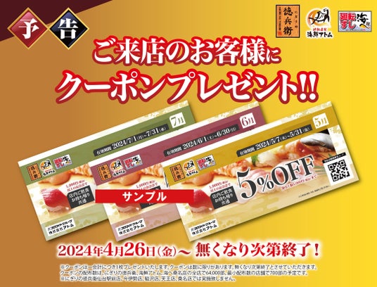 ※クーポンの配布数は、にぎりの徳兵衛、海鮮アトム、海へ桑名店の全店で64,000部、最小配布数の店舗で700部の予定です。