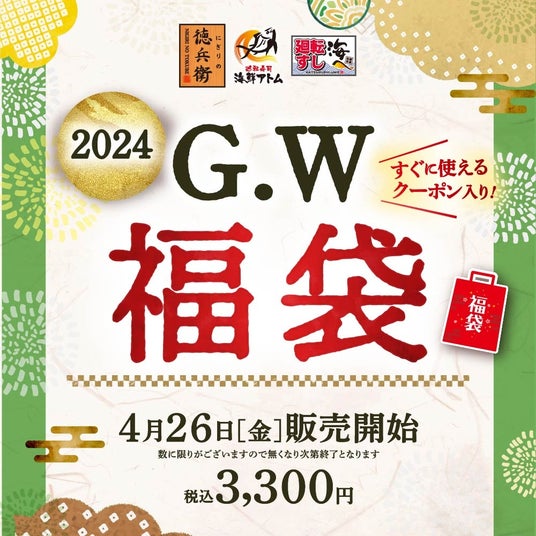 コロワイドグループの株式会社アトム(本社:神奈川県横浜市 代表取締役社長:小島保幸)は、回転寿司業態の「にぎりの徳兵衛」「海鮮アトム」「海へ」の計46店舗で、2024年4月26日(金)から【G.W福袋】を数量限定で販売いたします。