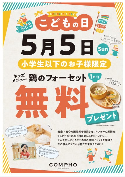 5月5日(木)に、コムフォー日本橋店、吉祥寺店、豊洲店では、小学生以下のお子様に限り、フォーを無料で提供いたします。通常の鶏のフォーのハーフサイズ、ポテト、ゼリーのセットです。
