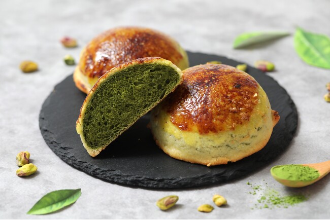こ だ わ り:抹茶風味のメロンパンの表面にピスタチオクリームを合