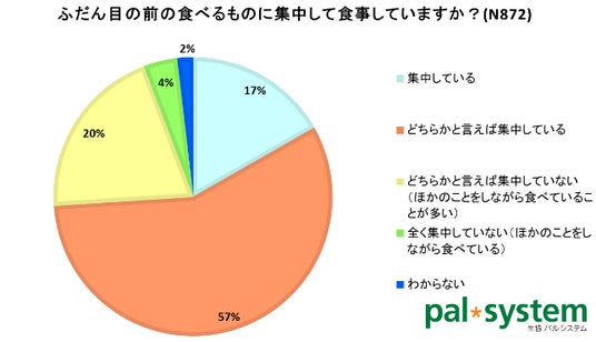 食事中「目の前の食事に集中しているか」という設問には、24%が「ながら食べ」をしていると回答しました。