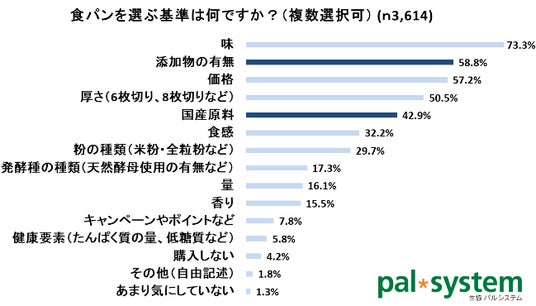 (1)食パンを選ぶ基準の1位は『味』(73.3%)2位は『添加物の有無』(58.8%)3位は価格(57.2%)