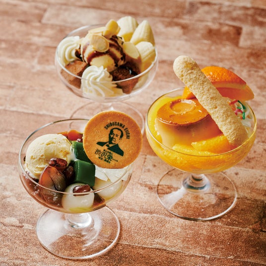 パフェ(土・日・祝日限定)…さまざまな具材を合わせ、お客様ご自身がオリジナルのパフェを作るスタイルで提供いたします。パフェの具材には渋沢栄一の好物とされる「オートミール」を使ったクッキーや抹茶パウンドケーキもご用意。また、抹茶パウンドケーキや抹茶ゼリーには埼玉県の狭山茶を使用いたします。
