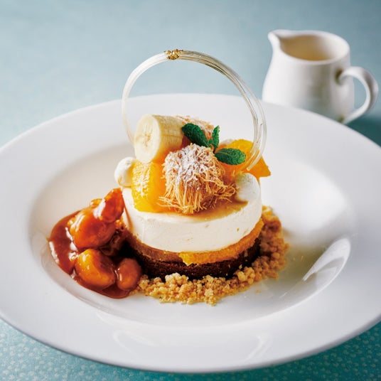 紬 ~つむぎ~オレンジとバナナのパルフェ。上にはカリカリ食感のカダイフで包んだ焼きバナナ、大きな弧を描いた飴細工をあしらい、渋沢栄一ゆかりの「富岡製糸場」の絹糸を表現しました。バナナとくるみの温かいキャラメルソースを合わせ、パルフェの冷たさとのコントラストもお愉しみいただきます。土台のガトーショコラ、ソテーしたオレンジの甘みと酸味が爽やかな余韻を残す一品です。