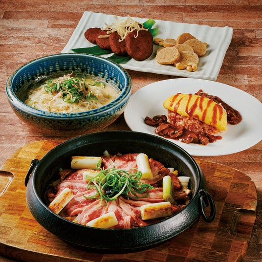 トップラウンジ オリゾンテ/手前から牛鍋、オムライス、冷やし汁うどん、ゼリーフライ(左)と、えびし(右)