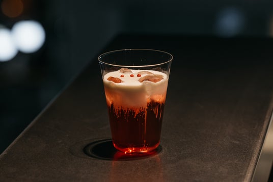 ▼和紅茶とクリームチーズのサワー 米焼酎をベースにラズベリーと和紅茶を合わせ、アールグレイ香るクリームチーズのエスプーマをトッピング。見た目にも華やかな2層のカクテル。