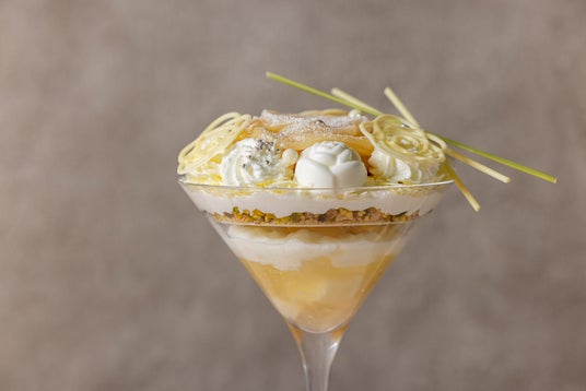 グラスにはソルティーライチジュレにグレープフルーツやライチ、ブラマンジェにレモンソルベを加え、フルーティーな味わいに仕上げました。その上に、食感のあるピスタチオやマスカルポーネクリーム、スフレチーズケーキなどを重ね、トップにはローズ風味の桃のコンポートで作ったローズを中心に、フロマージュブランセミフレッドやクリームでプレゼントの様にたくさんの想いを込めたブーケを表現しております。バニラココナッツミルクとはちみつのソースで味わいを変えながらお楽しみいただけます。