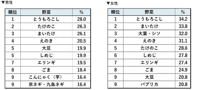 男女別:「指定野菜」でも「特定野菜」でもないが、「もっと食べたい」と思っている野菜(菌類・山菜等含む)トップ10