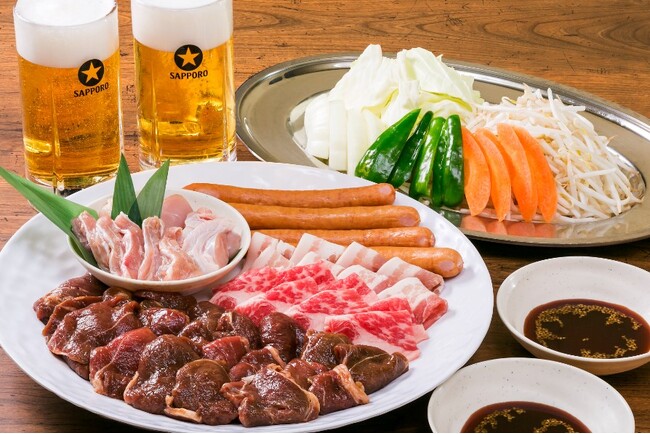名物のジンギスカンと牛・豚・鶏、野菜の食べ放題が楽しめるコース。