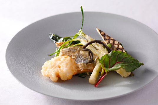ラングスティーヌのカダイフ巻きと稚鮎のフリット 行者にんにくのソース