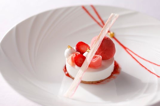 魚料理は、太刀魚のムニエルと白海老のフリットをご用意しました。旬の野菜のフリットやゼンマイ、ズッキーニと一緒にノワゼットソースでお楽しみください。肉料理では、茨城県産“常陸の輝き”豚ロースをソテーやシチューで贅沢にお召し上がりいただけます。デザートは、ルバーブと苺の味わいをフロマージュブランのムースと一緒にお楽しみください。