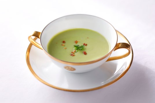 アミューズは旬のホワイトアスパラガスをババロアに仕立てました。前菜はラングスティーヌのカダイフ巻きに稚鮎のフリットや抹茶のブリオッシュを添えた一皿です。行者にんにくのソースでお召し上がりください。グリーンピースを使ったクリームスープは、心温まる味わいです。