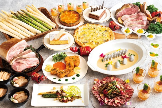 会津野菜を使ったソースで味わうコトレット、会津産馬肉のたたき、佐渡産とび魚のクネル、佐渡サーモンムースの前菜、会津のべこの乳モッツァレラチーズのマルゲリータピッツァなど、会津・佐渡の食材を用いた料理の数々をはじめ、会津ソースカツ丼や会津牛乳屋食堂のラーメンなどのご当地料理もブッフェに並びます。