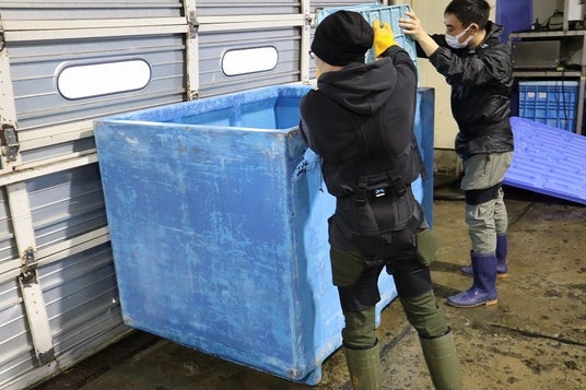 秋田県の漁業従事者に、船内・船外の作業それぞれの立場でマッスルスーツを着用いただき、着用の違和感の 有無や、作業の効率化、腰への負担感軽減などの有用性を確かめる現地実証を実施予定です。船内作業はコンテ ナ運搬や水産物の選定等、船外作業は市場などでの魚の選別、計量、コンテナ運搬の作業等を想定しており、そ れぞれの観点で有用性をチェックいただく予定です。