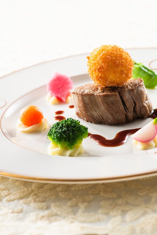 ・村上牛フィレ肉のソテーに村上牛のクロケットをのせて 彩り野菜添え 赤ワイン風味のソース ~フランベサービス~
