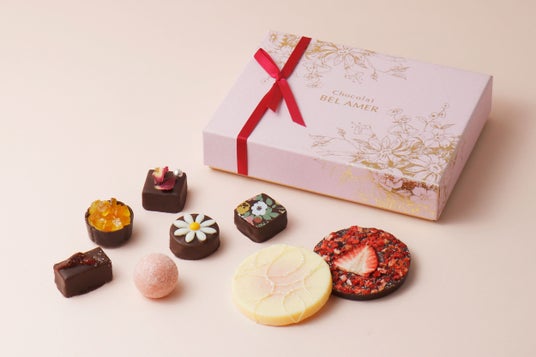 ローズ香る「ローズピーチ」、「トリュフ フランボワーズ キャラメル」など、このアソート限定のボンボンショコラと、季節のボンボンショコラ、限定のパレショコラをセットしました。
