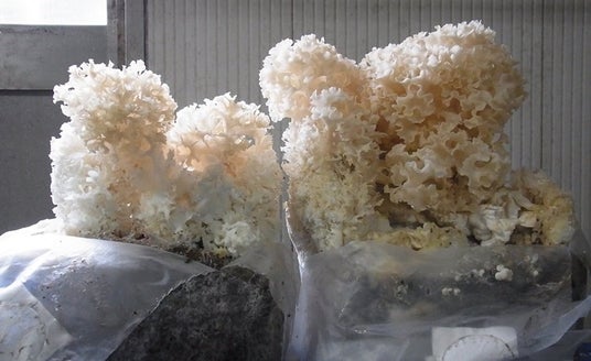 画像左:通常栽培のハナビラタケ 画像右:コーヒー抽出後の粉を使用した栽培のハナビラタケ
