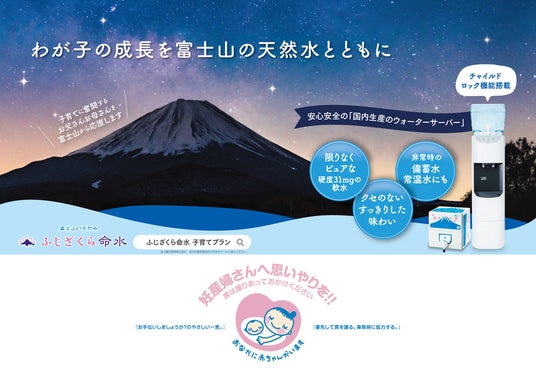 富士山の天然水ウォーターサーバーの提供を開始して昨年で10年を迎えた「ふじざくら命水」では、お客様のライフスタイルに沿った様々なプランを展開しており、その中のひとつ「子育てプラン」は、妊娠・授乳中の方~中学生のお子様を持つ子育て世帯を対象としたプランです。
