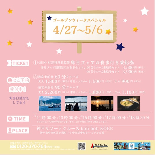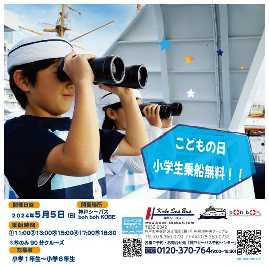 5月5日こどもの日限定、小学生乗船無料キャンペーン!今年もこどもの日は小学生を対象として無料でboh boh KOBEにご乗船いただけます。さらに、通常週末に数量限定で販売してるミシュラン一つ星を獲得した京都の日本料亭「杦-SEN-」の杉澤料理長監修の「神戸食」を、ゴールデンウィーク期間にもお召し上がりいただけます!ゴールデンウィークはboh boh KOBEで家族と一緒にあそboh boh(遊ぼう)♪