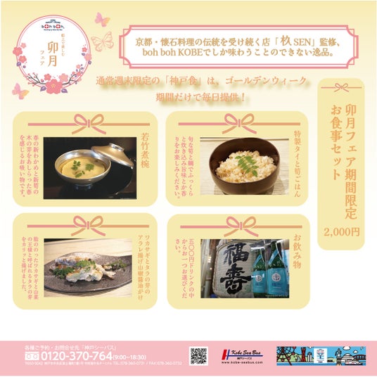 通常週末限定の「神戸食」は、今回特別にゴールデンウィーク期間は毎日販売しております!「卯月フェア」では、ミシュラン一つ星を獲得した京都の日本料亭「杦-SEN-」の杉澤料理長監修の元、日本文化と拘わりぬかれた季節の食材を掛け合わせた「神戸食」として、特製タイと筍ご飯や若竹煮椀などを販売しております。神戸シーバスboh boh KOBEでしか味わうことのできない逸品をぜひお楽しみください!