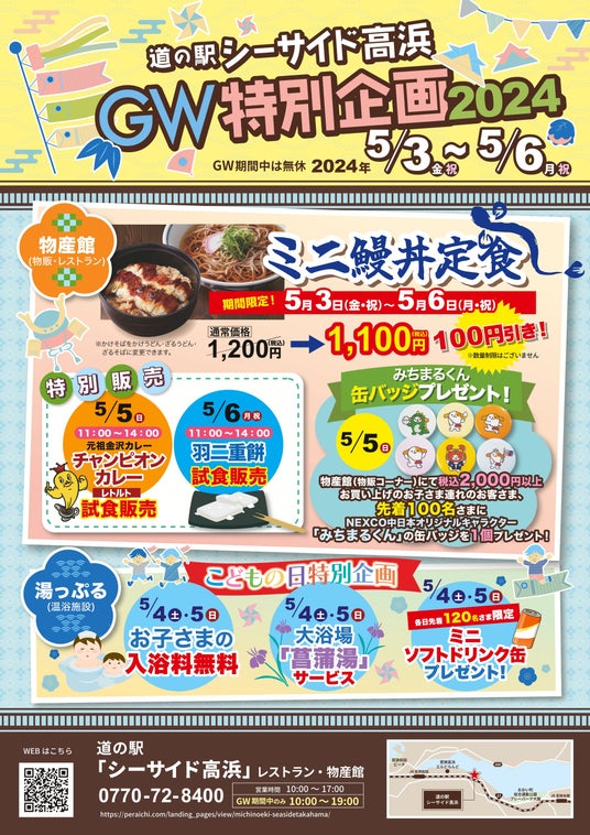 中日本エクシス株式会社 福井・近江支店(福井市、支店長・鈴木(すずき)智之(ともゆき))は、福井県大飯郡高浜町より指定管理を受け運営している「道の駅シーサイド高浜」において、日頃の感謝の意をこめて「GW特別企画2024」を、2024年5月3日(金・祝)から5月6日(月・休日)まで開催します。