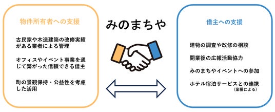 上述した取組を経て、近年ではみのまちやの活動を知った物件所有者から直接活用についての相談をいただくまでになりました。今後はこのように相談をいただいた町中の物件をみのまちやでお預かりしたうえで改修までを行い、オフィス事業や空家イベントで繋がりを持った物件を活用したい事業者に貸し出しまでできるような開発も視野に入れています。